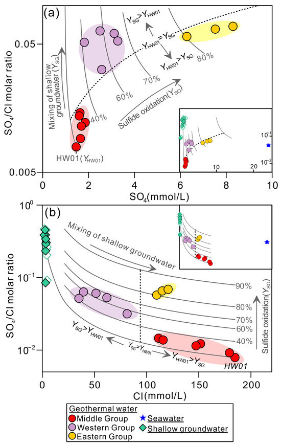 With an average SO4 concentration of 0.94 ± 0.31 mmol/L and a Cl concentration of 3.25 ± 0.83 mmol/L for shallow groundwater (Figure 7), the results show that the sulfates of the Middle Group geothermal water samples are less affected by the mixing of shallow groundwater (0–31%) and sulfate oxidation (<27%) and are dominated by sulfate from HW01 (46–85%). In contrast, sulfide oxidation contributes significantly to the sulfate content in the Western Group and Eastern Group geothermal water samples. For the Western Group samples, the proportions of sulfate produced by sulfide oxidation range from 43 to 66%, with the contributions of shallow groundwater (23–47%) being greater than those of deep geothermal water (8–19%). For Eastern Group samples, sulfide oxidation contributes 80–85% of the total SO4, with higher proportions of sulfate from HW01 (10–12%) than from shallow groundwater (5–8%).