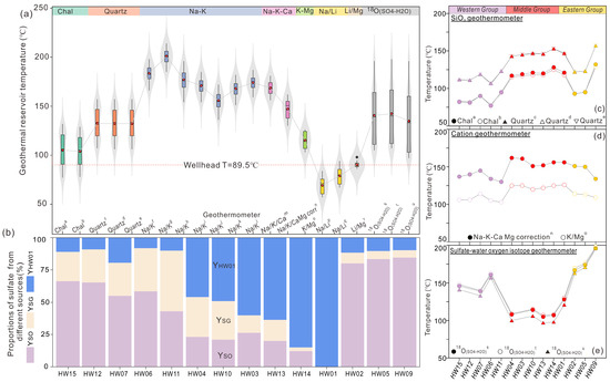 (a) Geothermal reservoir temperatures estimated by chalcedony and quartz geothermometers (a [8], b [64], c [10], d [8], e [65]), cation geothermometers (f [11], g [13], h [66], i [67], j [64], k [12], l [68], m [14], n [9], o [13], p [69], q [70]; r [71]) and sulfate–water oxygen isotope geothermometers (s [72], t [16], u [35]). The box plots and violin plots show the median, top and bottom quartiles. (b) Stacked bar chart of proportions of sulfate from sulfide oxidation (YSO), shallow groundwater (YSG) and HW01 (YHW01); (c–e) spatial fluctuation patterns of geothermal reservoir temperatures. Chal: chalcedony.