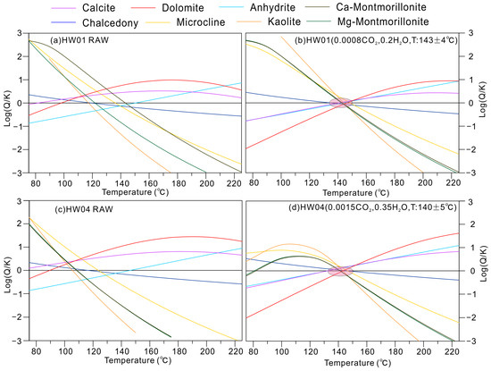 Compared with classical geothermometers, which calculate the solubility of a few minerals or (semi-)empirical correlations, geothermometric modeling involves complete fluid analyses and a solid thermodynamic basis [7,73]. It is useful to identify equilibrated and nonequilibrated waters, especially to detect and eliminate mixing and CO2 loss processes to reconstruct the existing equilibrium information. The geothermal reservoir in the study area is dominated by sandstone, consisting of quartz, plagioclase, K-feldspar, clay, calcite, anhydrite and dolomite (Table S5). Based on the lithology of the geothermal reservoir in the study area and in similar geothermal environments, an assemblage of eight minerals, including chalcedony, microcline, calcite, dolomite, kaolinite, Ca-montmorillonite, Mg-montmorillonite and anhydrite, were selected for thermodynamic simulation. Geothermometric modeling was conducted for samples HW01 and HW04, which are not significantly related to shallow processes of sulfate oxidation.