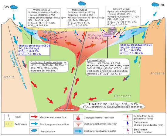A conceptual model showing the evolution of geochemical characteristics and sulfur and oxygen isotope of sulfate in geothermal water.