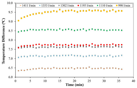 - At 1110, 1195, and 1411 L/min oil flow rate, the oil outlet temperature is 33.8 °C, 32.9 °C, and 32.1 °C, respectively. This situation shows that the PTHEs used in the new TBCS can provide sufficient cooling even when the water flow rate decreases and the increase in the oil circulation flow rate is effective in reducing the APT and the temperature of the oil leaving the bearing.