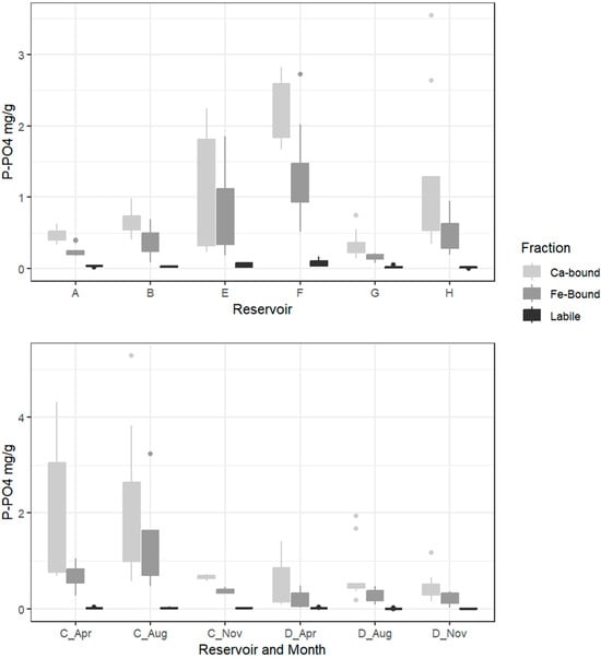 All reservoirs showed P storage in the form of Fe-P (Figure 1). Reservoirs A, B, and G had lower levels of Fe-P (0.1–0.5 mg/g), while Reservoirs E, F, and H had a higher range of Fe-P (0.3–1.8 mg/g). Reservoir C had higher Fe-P in April and August (0.5–1.6 mg/g), and moderate levels in November (0.5 mg/L). Reservoir D had 0.2–1.9 mg/L Fe-P throughout the year. There was no correlation between Fe-P and iron content in the sediments. In comparison, all sites had lower levels of labile phosphate (up to 0.14 mg P-PO4/g dry sediment; Figure 1). For all reservoirs the highest pool of P was Ca-bound. Reservoir A, B, and G had lower levels of Ca-P at 0.2–0.7 mg/g, while Reservoirs E, F, and H had higher levels of Ca-P (0.3–2.6 mg/g). Reservoir C had the highest range in Ca-P (0.7–5.1 mg/g). Reservoir D had moderate levels of Ca-P throughout the year (0.8–1.1 mg/L).