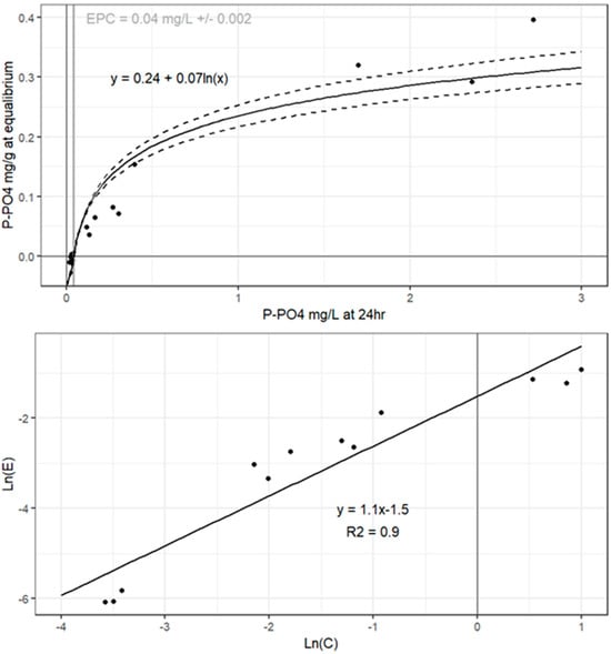 The equilibrium phosphorus capacity (EPC) is calculated by plotting the final phosphate concentration, mg/L P-PO4 (C), and the amount of phosphate absorbed per gram of dry sediment at equilibrium, mg/g P-PO4 (E). The logarithmic trend was calculated in R [25]. The standard error for the EPC was calculated by adding the standard errors from the output to the equation below for c and m and determining the difference between the two. Data were fitted to the Freundlich equation which expresses the rate and capacity of the absorption. The output determined the intercept (c) and gradient (m) along with the standard error (se), from the trendline: