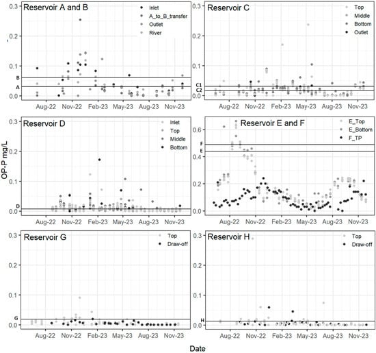 Between June 2022 and December 2023, between 0.5 and 1L of accompanying reservoir water was collected from multiple locations within each reservoir (except Reservoir F) at different depths (surface water, a mid-point in the water column, and the bottom of water column near the sediment). The samples were stored at 4 °C prior to analysis. A 1-mL aliquot of each sample was filtered through a 0.45-µm nylon filter before being analysed for OP (as above). For Reservoir F, total phosphate (TP) data were provided by Company 3.