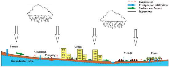 With the continuous acceleration of urbanization in urban areas, land use patterns are constantly changing, and the levels of groundwater extraction, lateral recharge from surrounding environments, precipitation infiltration, and evaporation have also changed, leading to variations in urban groundwater resources (Figure 1). Human activity can also alter the pollutant flux entering the groundwater aquifer from the surface, resulting in changes in pollutant concentrations in groundwater aquifers. The GW-ECC of urban areas changed under the combined influence of changing groundwater resources and pollutant concentrations.