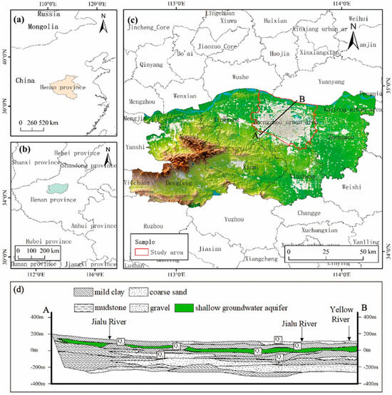 Schematic of the study area: (a) location, (b) Henan province, (c) study area, and (d) hydrogeological profile in the study area.