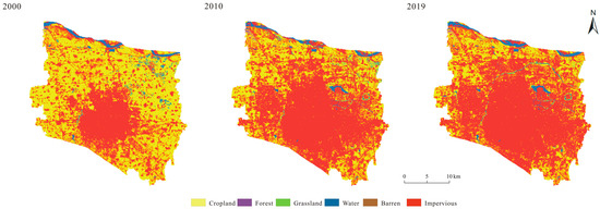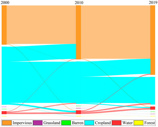 From 2000 to 2019, the cropland area within the study region decreased by 290.14 km2. Specifically, 42.22% of the cropland remained stable, 55.69% transitioned to impervious land, and the remaining 2.09% was converted to other land use classifications. Additionally, the water area diminished by 1.53 km2, with 40.74% of the water area persisting, 30.61% transforming into cropland, and 28.61% becoming impervious area. The changes in the areas of other land use classifications were relatively minor: the barren area decreased by 0.01 km2, the grassland area by 0.06 km2, and the forest area by 0.6 km2.