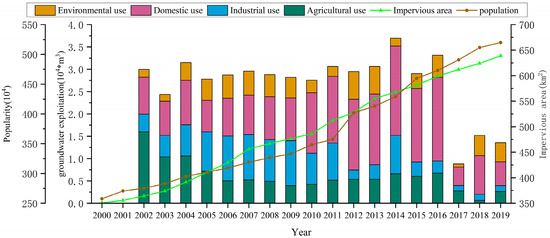 Urban groundwater development (2000–2019). Annual groundwater use (bars) in terms of different water use sectors (104 m3), including domestic, agricultural, industrial, and environmental water use; and urban development index (lines), including impervious area (km2) and urban population. Data from the Water Resources Bulletin. Groundwater extraction data from 2000 to 2001 are not presented because of a lack of data.