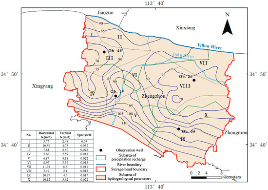 In this study, for the flow field boundary conditions, except for the northern boundary of the Yellow River, which was delineated as a river boundary, the other boundary in the horizontal direction was generalized as a constant head boundary. According to the hydrogeological conditions in Zhengzhou, the urban area can be divided into 10 hydrogeological parameter zones based on their different permeability coefficients and specific yields. The results of the generalized flow field are shown in Figure 6.