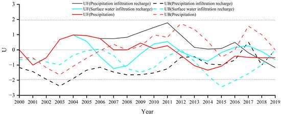 The Mann–Kendall rank test was used to analyze the variation trends of precipitation infiltration recharge and surface water infiltration recharge from 2000 to 2019 (Figure 7). Most of the time, the UF value of precipitation infiltration recharge was less than zero. This indicates that the overall recharge of precipitation in the study area displayed a downward trend and was influenced by changes in precipitation and urban areas. Precipitation recharge decreased from 0.56 × 104 m3 in 2000 to 0.33 × 104 m3 in 2019. The variation trend in precipitation infiltration recharge before 2010 was similar to that of precipitation, indicating that precipitation had a significant influence on the precipitation infiltration recharge at this stage. After 2010, the change in precipitation infiltration recharge showed a downward trend, whereas precipitation showed an upward trend. In addition, the increase in impervious surfaces in the study area after 2010 was greater than before (Figure 4). In addition, the increase in impervious surfaces in the study area after 2010 was greater than before 2010 (Figure 4). This indicates an increase in the impact of changes in urban areas on precipitation infiltration.