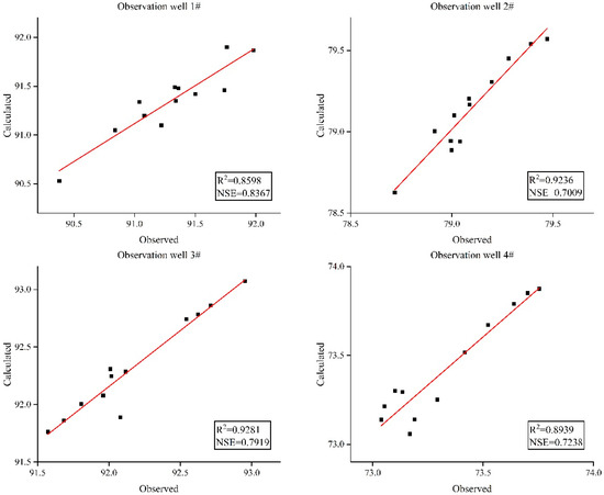 The results of model validation. Monthly water level data from four observation wells were used to validate the model, and the NSE and R2 values were selected to evaluate the degree of fit of the model.