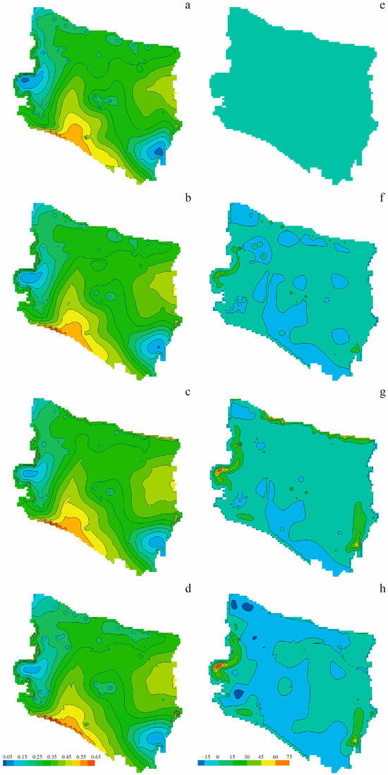 Isoline of GW-ECC at the beginning of each season in 2019 (mg/L) (left); rate of GW-ECC change at the beginning of each season in 2019 (%) (right) for (a,e) March, (b,f) June, (c,g) September, and (d,h) December.