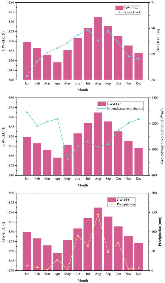 In terms of temporal changes (Figure 10), the GW-ECC in the study area displayed a trend of “decrease-rise-decrease” and reached its annual peak (1872.39 t) in August. Considering the variations in precipitation and river water levels, it was observed that the trend of GW-ECC was generally consistent with those of precipitation and river water levels. This indicates that with the onset of the flood season, the groundwater system in the study area received increased recharge from precipitation and lateral seepage from the river, leading to an increase in groundwater levels and groundwater resources. At the same time, the pollutant emission concentration remained unchanged, resulting in noticeable growth in the GW-ECC during the wet season. During the dry season, the city’s groundwater extraction volume increased compared to wet years, whereas precipitation and river recharge remained at lower levels. This ultimately leads to a decline in groundwater resources, resulting in a lower groundwater environmental capacity during the dry season than during the wet season.