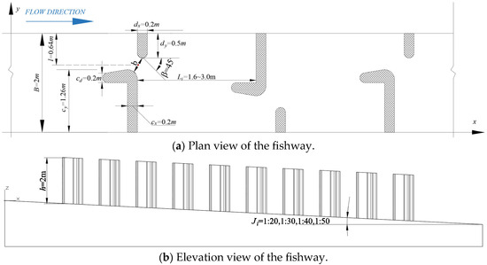 This study involved a fishway located at a water conservancy project on the Han River in Hubei Province, China, which is a critical protection area for the Four major Chinese carps. The Vm within the fishway must not exceed the burst swimming speed of the fish [20], which was identified as less than 1.2 m/s for the four major Chinese carps [21,22,23]. The fishway, designed with a water depth of 2 m, a design discharge of 3.2 m3/s, and a flow velocity of 0.8 m/s, was developed considering the hydrological conditions and the specifications of the hydraulic structure.