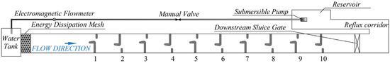 The validation data in this study were obtained from local model tests of the fishway associated with the aforementioned hydraulic engineering project. The experimental setup includes an inlet, an outlet, and ten conventional pools, each measuring L = 2.4 m, B = 2 m, and J = 1:20. The experimental water depth was maintained at 2 m. The model was constructed based on the Froude number similarity. With reference to existing research [14,24], the experimental ratio was set at 1:5. Tests were conducted in a multifunctional test tank, which features plexiglass panels for the sides, bottom, and baffles, with installation errors maintained blow 0.2 mm. The test tank consists of a water reservoir, an energy dissipation mesh, an electromagnetic flowmeter, a manual valve, a downstream sluice gate, a submersible pump, a reflux corridor, and other components. Its inlet section is 4 m long and equipped with an energy dissipation mesh to ensure uniform and smooth flow upstream to the first level of the fishway, while the 4 m long tailgate exit eliminates water turbulence. The experimental setup is illustrated in Figure 2. During testing, the inlet flow was regulated using the manual valve, and the flow rates were measured by the electromagnetic flowmeter, which has an accuracy of 0.4% and a sampling frequency of 10 Hz. To ensure a consistent water depth across all pools, the water depth was regulated by downstream sluice gates, with a water level difference of 0.12 m between adjacent pools.