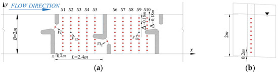Layout of flow velocity measurement points in the chamber at L/B = 1.2 of the J1 = 1:20: (a) Within the chamber; (b) At the vertical slots.