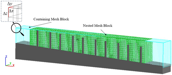 A full-scale physical model was utilized to construct a numerical fishway model. A structured hexahedral mesh that demonstrates good convergence properties was utilized. A containing block was applied to the entire model, while a nested block with refined elements was employed for the target study area. The mesh was automatically aligned with the geometry, and grid processing was performed using the FAVOR function. To enhance numerical accuracy and solution convergence, the model’s geometry was refined by selecting an appropriate mesh size for grid division. Based on related research [49], a recommended grid refinement ratio (r = Gcoarse/Gfine) of 1.3 was adopted. The mesh size and total number of elements are presented in Table 1, and Figure 3 shows the mesh configuration.