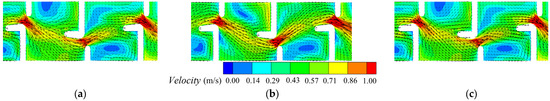 As shown in Figure 5, the velocity vectors were extracted at different depths of z = 0.75 h, 0.50 h, and 0.25 h (where z is the depth of the cross-section and h is the water depth), referred to as the surface, middle, and bottom layers, respectively. The flow patterns at these layers for the VSF were fundamentally similar, and the flow field distribution patterns at different water depths were also similar. Due to the resemblance in the flow field distribution patterns at different water depths, a representative mid-level flow field was selected for analysis.