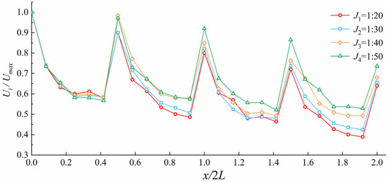 The longitudinal maximum velocity curves for different pool chamber L/B ratios under varying slope ratios were derived from numerical simulations. As an example, the longitudinal maximum velocity curves for pools with different L/B ratios at a bottom slope ratio of J1 = 1:20 were analyzed, as shown in Figure 10. The distributions of these curves under varying L/B ratio conditions were similar. After the first vertical slot jet, the flow decelerated, reached a trough before the second vertical slot, and then accelerated as it passed through the slot. As the L/B ratio increased, the location of the peak velocity shifted towards the vertical slot. This was due to the fact that when the L/B ratio was between 0.6 and 0.8, the mainstream water did not dissipate sufficient energy during its forward movement in the pool chamber. The flow was further dissipated by the disturbance effects of the rectifier baffle, causing the water to decelerate and then accelerate upon entering the vertical slot. In contrast, when the L/B ratio was greater than or equal to 0.9, the mainstream water dissipated sufficient energy before reaching the next vertical slot, and the flow velocity increased immediately as it passed through the slot. To ensure appropriate curvature at the junctions of adjacent pools and to prevent the occurrence of wall-attached flow, it is recommended that the L/B ratio be maintained within the range of 0.9 to 1.1.