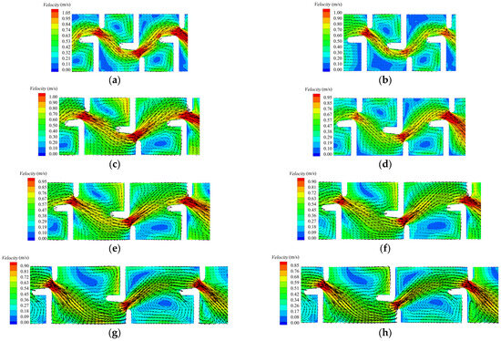 Flow velocity distribution in the chamber at different L/B ratios: (a) J1 = 1:20, L/B = 0.6; (b) J2 = 1:30, L/B = 0.6; (c) J1 = 1:20, L/B = 0.8; (d) J2 = 1:30, L/B = 0.8; (e) J1 = 1:20, L/B = 1.0; (f) J2 = 1:30, L/B = 1.0; (g) J1 = 1:20, L/B = 1.2; (h) J2 = 1:30, L/B = 1.2.