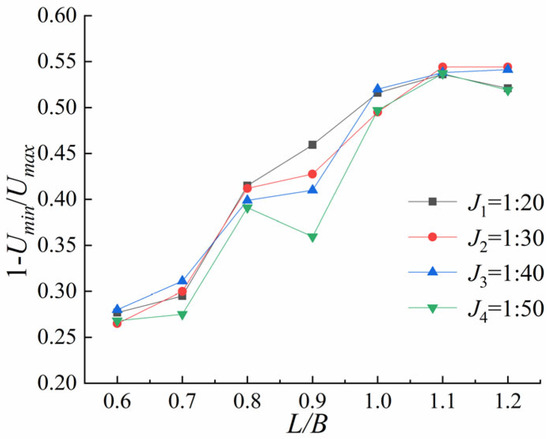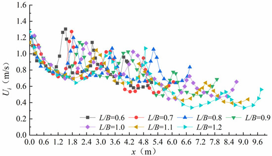 The maximum attenuation rate of the mainstream velocity for different pool chamber L/B ratios at various bottom slope ratios is shown in Figure 11. Generally, a larger change in the maximum mainstream velocity along the flow path corresponded to a more significant decay rate, indicating higher head loss and enhanced energy dissipation, which is beneficial for fish migration [52,53]. The results showed that, for a fixed L/B ratio, the distribution patterns of the mainstream maximum velocity decay rate along the flow path were similar across different slope ratios. Specifically, as the L/B ratio increased, the decay rate along the flow path also increased. When the L/B ratio exceeded 1, the velocity decay rate stabilized along the flow path.