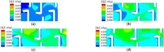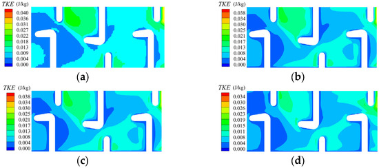 Distribution of TKE in the chamber at different L/B ratios for J1 = 1:20: (a) L/B = 0.6; (b) L/B = 0.8; (c) L/B = 1.0; (d) L/B = 1.2.