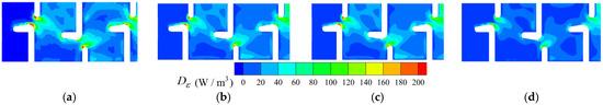 Figure 14 illustrates the distribution of under varying slope ratios. The highest values of were located at the heads of the divider baffles and at the angles of the rectifier baffles. Although these regions exhibited higher values, they were relatively small and had minimal impact on fish upstream migration. In contrast, was lower in the recirculation zones, which occupied a larger area. As the slope ratio decreased, also decreased; however, the overall distribution pattern remained unchanged.