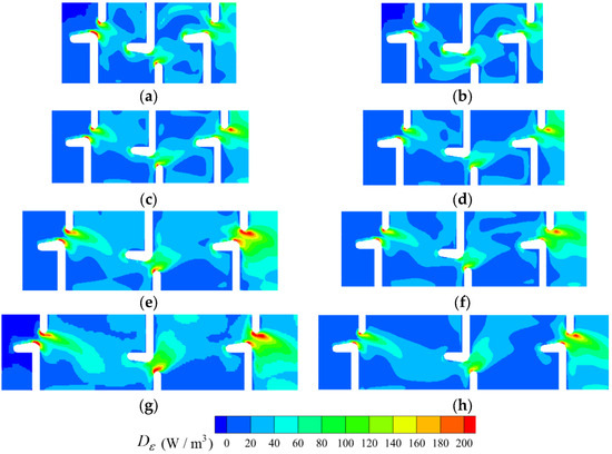 Distribution of in the chamber under different L/B ratios: (a) J1 = 1:20, L/B = 0.6; (b) J2 = 1:30, L/B = 0.6; (c) J1 = 1:20, L/B = 0.8; (d) J2 = 1:30, L/B = 0.8; (e) J1 = 1:20, L/B = 1.0; (f) J2 = 1:30, L/B = 1.0; (g) J1 = 1:20, L/B = 1.2; (h) J2 = 1:30, L/B = 1.2.