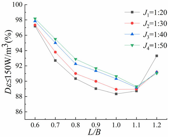 Figure 15 and Figure 16 illustrate the distribution of under different L/B ratios for slope ratios of J1 = 1:20 and J2 = 1:30, and the area proportion of the pool chamber with (Ap) for different L/B ratios, respectively. Figure 15 indicates that was predominantly distributed in the recirculation zones. According to Figure 16, for a slope ratio of J1 = 1:20, the minimum Ap occurred when the L/B ratio equaled 1, whereas for J2 = 1:30, the minimum Ap appeared when the L/B ratio equaled 1.1. This phenomenon was attributed to the increase in flow velocity with rising slope ratios, which led to the earlier onset of wall-attached flow and a quicker reduction in Ap. For a given slope ratio, as the L/B ratio increased, Ap initially decreased and then increased. For instance, when J1 = 1:20 and the L/B ratio was less than 1, an increase in the pool chamber length resulted in higher . Furthermore, the increase in maximum flow velocity was relatively high, thereby leading to better energy dissipation and a reduced Ap. However, when the L/B ratio exceeded 1, as the pool chamber length continued to increase, some of the flow from the vertical-slot jet began to interact with the pool chamber walls, further enhancing energy dissipation. At this point, the chamber length became sufficiently long, causing a slight increase in Ap.