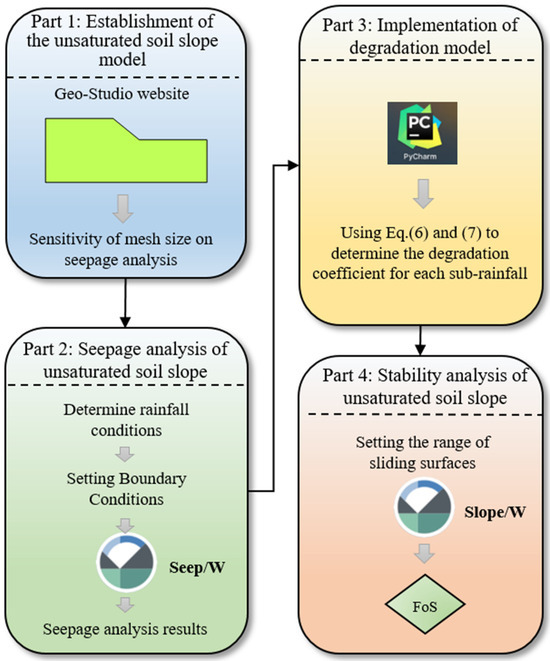 The flowchart of the proposed methodology is demonstrated in Figure 1. It can be seen that the proposed methodology consists of four parts: Part 1: establishment of the unsaturated soil slope model; Part 2: configuration of rainfall conditions; Part 3: implementation of degradation model; Part 4: stability analysis of unsaturated soil slope.