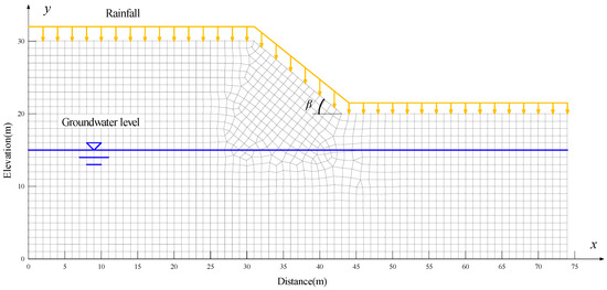 As shown in Figure 2, the homogeneous soil slope has a height of 10 m with an inclination angle (β) of 39.81°. Following the assumption in [5], the horizontal groundwater level is found 15 m below the top slope surface (i.e., at y = 15 m). It is worth noting that the horizontal groundwater level assumption may not be the case in practice, and the field monitoring records can be easily incorporated into the proposed study. The unit weight of soil denoted by γ is 20 kN/m3. The respective original cohesion c0 and friction angle φ0 are 2 kPa and 26°. The saturated permeability coefficient Ks is 1.0 × 10−6 m/s. Following the configurations at www.geoslope.com, the detailed parameters for the seepage and stability analysis are summarized in Table 1. The proper choice of hydraulic boundaries is important for seepage analysis. The left and right sides of the slope have a constant water head of 15 m to simulate an initial groundwater level. As signified by the hollow arrows in Figure 2, the rainfall infiltration condition with surface run-off is imposed on the slope surface. A zero-flux boundary condition is applied on the bottom and the left and right sides above the groundwater level. The results from the official website, www.geoslope.com, are regarded as the benchmark. A sensitivity study of the effect of mesh size on steady state seepage analysis was performed, and the consequent recommendation is a balanced mesh size = 0.5 m, leading to the combination of 7348 quadrilateral and triangular elements. Therefore, the mesh configuration of 7348 quadrilateral and triangular elements was adopted to conduct the transient seepage analysis with intermittent rainfall.