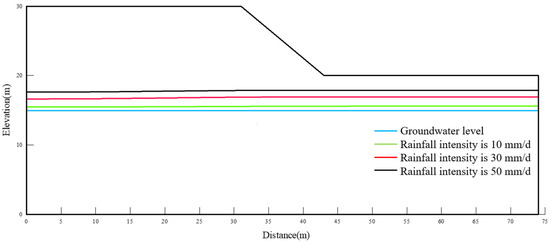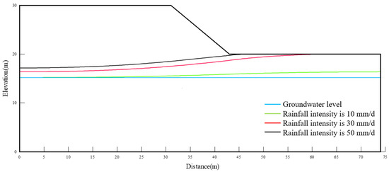 To further illustrate the increases in FoS within the additional three days after the end of the rainfall, the locations of the phreatic lines for R1 = 10, 30 and 50 mm/d at t = 7 d are plotted in Figure 6. As shown in Figure 6, the blue dashed line represents the initial phreatic line, while the green, red and black lines denote the phreatic lines for R1 = 10, 30 and 50 mm/d, respectively, at t = 7d. By comparing the phreatic lines in Figure 3 and Figure 6, it becomes evident that the curved phreatic lines in Figure 3 are all reshaped as horizontal lines. This indicates that after the end of the rainfall, the rainwater continues to infiltrate downwards, making the saturated soils close to the slope surface unsaturated again. This transformation of the soils from saturated to unsaturated yields a rise in FoS, which can be observed in Figure 5. In addition, a higher intensity of rainfall results in a higher phreatic line at t = 7 d and, hence, the FoS with the higher intensity of rainfall is smaller than that with the lower intensity of rainfall.