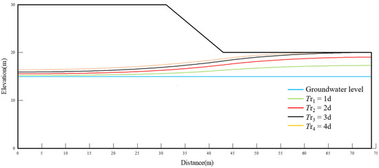 Consider M = 1 and R1 = 30 mm/d (corresponding to heavy rainfall) as an example. Tr1 takes 1, 2, 3 and 4 d. The transient seepage analysis for each Tr1 is executed, and the phreatic line within the slope at t = Tr1 is located and plotted in Figure 4. As shown in Figure 4, the blue line represents the initial phreatic line corresponding to the groundwater level (y = 15 m), while the green, red, black and orange lines are the phreatic lines corresponding to t = Tr1 of 1, 2, 3 and 4 d, respectively. It is anticipated that for the same intensity of 30 mm/d rainfall, the phreatic line will tend to be closer to the slope surface at y = 20 m as the rainfall duration increases from 1 d to 4 d. As a result, when the rainfall intensity remains constant, the longer the rainfall duration, the higher the phreatic line within the slope. An elevated phreatic line increases the pore water pressure in the soil, which in turn reduces the effective stress and shear strength of the soil. As a result, the risk of slope failure (e.g., landslides or debris flows) may increase.