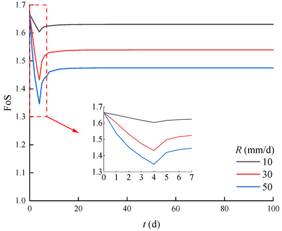 Figure 13 demonstrates that when Dmin = 0.5 and R = 10 mm/d, the second and third minimum FoS are 1.34 and 1.11, respectively. When Dmin = 0.45 and R = 20 mm/d, the corresponding minimum FoS values are 1.18 and 0.94. When Dmin = 0.4 and R = 30 mm/d, the second and third minimum FoS are 1.08 and 0.84, respectively. It can be observed that the smaller the value of Dmin, the lower the FoS.