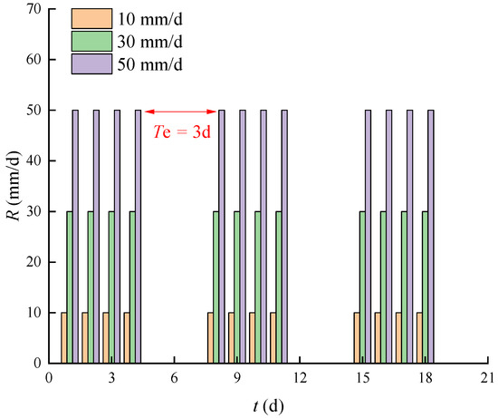Let Ri denote the intensity for the ith sub-rainfall, Tri denote the ith sub-rainfall duration, M denote the number of sub-rainfall, and Tei denote the rainfall intervals between the ith and i + 1th sub-rainfall within an intermittent rainfall. Based on the Rainfall Grade Standard published by the China Meteorological Administration (https://www.cma.gov.cn), the selected representative intensity values for moderate rain, heavy rain and torrential rain are 10, 30 and 50 mm/d, respectively. Table 2 lists the details of the designed intermittent rainfall. This section will investigate the impact of rainfall intensity, rainfall duration and rainfall intervals on the slope stability. As demonstrated in Table 2, a variety of intermittent rainfall scenarios can be designed by choosing one potential value from the corresponding list. Only part of the full total of combinations is considered in this section to study the influence of rainfall parameters.