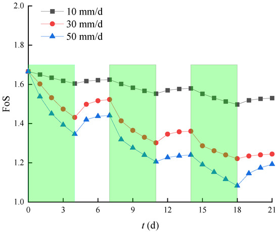 Figure 8 plots the variation of the FoS with time step t for R1 = R2 = R3 = 10, 30 and 50 mm/d. The green part of the graph shows the rainfall holding time. Taking R1 = R2 = R3 = 50 mm/d (representative of torrential rainfall) as an example, the respective FoS values are 1.67, 1.53, 1.45, 1.39, 1.34, 1.41, 1.43, 1.44, 1.31, 1.27, 1.23, 1.20, 1.22, 1.23, 1.24, 1.19, 1.15, 1.11, 1.08, 1.14, 1.17 and 1.19. It is demonstrated that the variation curve of the FoS with time step t is divided into three separate sub-curves, each of which is similar to those in Figure 5. The minimum bold FoS 1.34, 1.20 and 1.08, are found at t = 4, 11 and 18 d, corresponding to the end of the first sub-rainfall, second sub-rainfall and third sub-rainfall, respectively. As explained in Section 4.2.1, the FoS after one sub-rainfall is unable to restore the original one (before the sub-rainfall, i.e., at t = 0, 7 and 14 d). It is anticipated that as M increases, the slope stability will deteriorate continuously until failure. As a result, the reinforcement works should be executed before the FoS is decreased to a value necessitating the early warning. Referring to the technical code for building slope engineering (GB 50330-2013) [43], the illustrative slope shown in Figure 2 is classified into Grade 3 and the allowable FoS is 1.25. From this perspective, after the end of the second rainfall, managers should implement reinforcement or drainage works to enhance the slope stability, because the FoS 1.20 is smaller than the recommended value of 1.25. Similarly, the minimum FoS values found at t = 4, 11 and 18 d are 1.60, 1.55 and 1.49 for an intensity of rainfall = 10 mm/d (representative of moderate rainfall), and they are 1.43, 1.30 and 1.22 for R1 = R2 = R3 = 30 mm/d (representative of heavy rainfall). It is found that for heavy rainfall, the reinforcement or drainage works should be executed after the end of the third sub-rainfall, and no reinforcement or drainage works is required for moderate rainfall under M = 3.