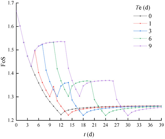 Variation of FoS with t at Te1 = Te2 = 0, 1, 3, 6, 9 d for R1 = R2 = R3 = 30 mm/d.
