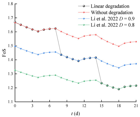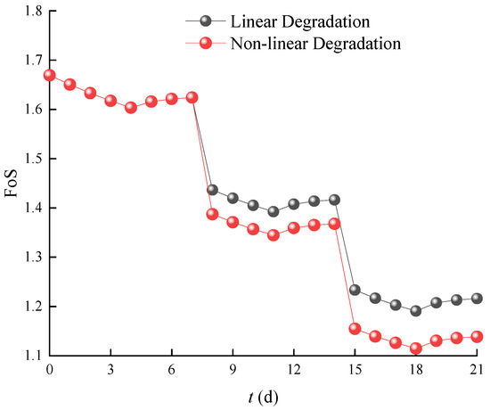 Figure 11 shows that when t ranges from 0 to 21 d, the corresponding FoS values for the slope are 1.67, 1.65, 1.63, 1.61, 1.60, 1.61, 1.62, 1.62, 1.39, 1.37, 1.36, 1.34, 1.36, 1.37, 1.37, 1.15, 1.14, 1.13, 1.11, 1.13, 1.14 and 1.14, respectively, when the nonlinear degradation model is adopted. It is observed that the second and third minimum FoS values of 1.39 and 1.19 with the linear degradation model turn out to be 1.34 and 1.11 with the nonlinear degradation model. It is revealed that the nonlinear degradation model yields a smaller FoS (corresponding to a more conservative decision) than the linear degradation model.