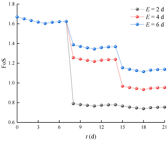 Consider M = 3, Tr1 = Tr2 = Tr3 = 4 d, R1 = R2 = R3 = 10 mm/d and Te1 = Te2 = 3 d as an example. Referring to the scenarios presented in Table 3, when E = 2 d and Dmin = 0.5, the value of ξ is determined to be 0.6931 using Equation (7). The degradation coefficient of soil properties such as cohesion and friction angle is determined to be 1.0, 0.5 and 0.5 for the first, second and third sub-rainfalls. When E = 4 d and Dmin = 0.5, the value of ξ is 0.2310. The degradation coefficient of the cohesion and friction angle is determined to be 1.0, 0.79 and 0.63 for the first, second and third sub-rainfalls. When E = 6 d and Dmin = 0.5, the value of ξ is 0.1386. The degradation coefficient of the cohesion and friction angle is determined to be 1.0, 0.87 and 0.75 for the first, second and third sub-rainfalls. The variation of the calculated FoS with t at different values of E is shown in Figure 12.
