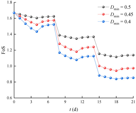 Consider M = 3, Tr1 = Tr2 = Tr3 = 4 d and Te1 = Te2 = 3 d as an example. Referring to the scenarios presented in Table 4, when E = 6 d, R = 10 mm/d and Dmin = 0.5, the value of ξ is determined to be 0.1386. The degradation coefficient of the cohesion and friction angle is determined to be 1.0, 0.87 and 0.75 for the first, second and third sub-rainfalls. When E = 6 d, R =20 mm/d and Dmin = 0.45, the value of ξ is 0.1597. The degradation coefficient of the cohesion and friction angle is determined to be 1.0, 0.85 and 0.73 for the first, second and third sub-rainfalls. When E = 6 d, R = 30 mm/d and Dmin = 0.4, the value of ξ is 0.1833. The degradation coefficient of the cohesion and friction angle is determined to be 1.0, 0.83 and 0.69 for the first, second and third sub-rainfalls. The variation of the calculated FoS with t at different values of Dmin is shown in Figure 13.