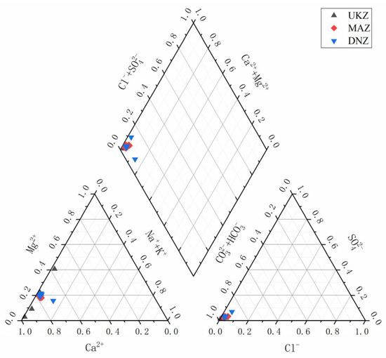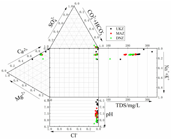 The Durov diagram uses triangular sections and their base axes to depict the relative mass concentration percentages of cations (Na⁺, K⁺, Ca2⁺, and Mg2⁺) and anions (HCO3⁻, SO42⁻, and Cl⁻), with arrows indicating increasing concentrations. The rectangular areas on the right and bottom are customized to include pH and TDSs according to the specific needs of this study. The Durov diagram effectively illustrates the primary chemical composition characteristics of groundwater, revealing hydrochemical types and their evolutionary processes [38].