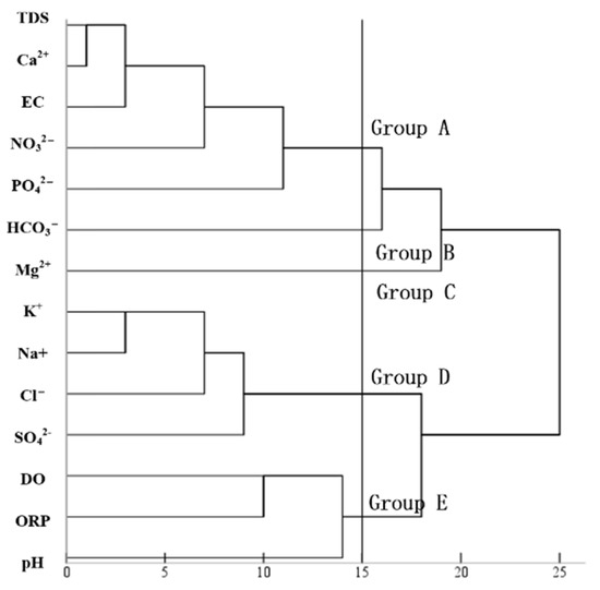 Hierarchical Cluster Analysis (HCA) was applied to classify hydrochemical parameters based on their similarity in spatial–temporal variability. The analysis utilized Euclidean distance as the dissimilarity metric and Ward’s minimum variance method as the linkage algorithm to minimize intra-group heterogeneity. Prior to clustering, all variables were standardized (z-scores) to eliminate scale-dependent biases. As shown in Figure 5, Through cluster analysis [45], five groups were formed based on hydrochemical parameters: Group A (TDSs, Ca2⁺, EC, NO3⁻, and PO43⁻), Group B (HCO3⁻), Group C (Mg2⁺), Group D (K⁺, Na⁺, Cl⁻, and SO42⁻), and Group E (DO, ORP, and pH). The varying relationships among these parameters are indicative of the water body’s physical attributes. In Group A, TDSs and EC are influenced by Ca2⁺, NO3⁻, and PO43⁻, indicating that these ions contribute significantly to conductivity and are primarily derived from dissolved sources. HCO3⁻ and Mg2⁺ are in distinct groups, suggesting that HCO3⁻ is the leading anion and a key component, while Mg2⁺ is relatively scarce and has a weak relation to other ions. The correlation between K⁺, Na⁺, Cl⁻, and SO42⁻ underscores their importance as primary indicators of regional industrial and agricultural pollution.