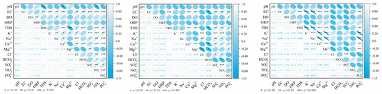 Through the application of multivariate statistical analysis, heatmaps of ion correlation [46] were produced for upstream, midstream, and downstream regions (Figure 6). In the upstream region, TDSs are strongly linked to the concentrations of Ca2⁺, HCO3⁻, and NO3⁻, pointing to prevalent dissolution processes in the underlying karst landscape where water sets ions in motion from the strata. A robust correlation exists between Ca2⁺ and HCO3⁻, with HCO3⁻ correlating solely with Ca2⁺, providing additional evidence of the carbonate strata characteristics. EC shows a noteworthy correlation with the majority of ions, and the upstream TDS measurements are elevated compared with those from the midstream and downstream regions, reflecting the ion-rich composition and vigorous dissolution in the subsurface karst system. In the midstream region, following the groundwater’s emergence at the surface, TDS has a connection with Ca2⁺ and Mg2⁺, while the correlation of HCO3⁻ with other parameters weakens, suggesting shifts in ion makeup and concentration due to differing water conditions. By the time the water reaches the downstream region, K⁺, Na⁺, Ca2⁺, Mg2⁺, Cl⁻, and PO43⁻ emerge as the primary ions, highlighting the influence of human activity.