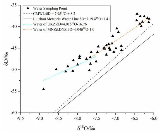 The δ2H and δ18O measurements from water samples within the study area were depicted on a δ2H–δ18O relationship diagram (Figure 7). The Chinese Meteoric Water Line (CMWL), which is based on nationwide precipitation samples collected in 1980, is expressed as δD = 7.9δ18O + 8.2. Considering geographical location and climatic factors, a local meteoric water line serves as a better representation of the regional conditions [49]. Due to the lack of precipitation samples from the study area, the Liuzhou Meteoric Water Line (δD = 7.19δ18O + 1.41, SMOW) was utilized as a reference point.