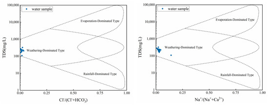 The Gibbs plot, which utilizes the relationship of TDS-Na+/(Na+ + Ca2+) and TDS-Cl-/(Cl− + HCO3−), pinpoints three key mechanisms that govern surface hydrochemistry: atmospheric precipitation, rock weathering, and evaporation–crystallization [51]. As shown in Figure 8, The majority of water samples from the study area are mainly located within the rock weathering control region (center–left of Figure 5), indicating that rock weathering plays a dominant role in determining the hydrochemical composition of both surface water and groundwater in this region. In contrast, the effects of atmospheric precipitation and evaporation-crystallization were relatively insignificant.