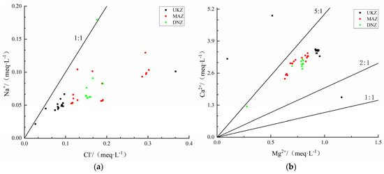 The chloro-alkali index (CAI) method (CAI-I and CAI-II) is applicable for analyzing cation exchange adsorption between groundwater and sediments [38]. When the CAI value is less than 0, it indicates that cation exchange adsorption has occurred, and the greater the negative value, the more significant the effect. In addition, the relationship between [γ(Ca2⁺) + γ(Mg2⁺) − γ(HCO3⁻) − γ(SO42⁻)] and [γ(Na⁺) − γ(Cl⁻)] can further analyze the cation exchange process in groundwater. Ion ratios reflect residual Ca2⁺ and Mg2⁺ after the dissolution or precipitation of calcite, dolomite, and gypsum, as well as remaining Na⁺ following the dissolution or precipitation of halite.