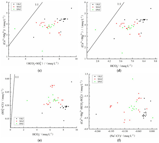 The chemical origins and evolutionary processes of surface water and groundwater in the study area were thoroughly examined using ion ratio diagrams [53]. Figure 9a shows the relationship between Na+ and Cl−. Most of the water samples were located below the 1:1 line, indicating that γCl⁻ in the water samples was greater than γNa⁺. This implies not only the dissolution of halite, but also the impact of human-induced pollution from both industrial and domestic sources, particularly evident in the midstream human activity zone. In contrast, the upstream karst groundwater remained relatively unaffected. The γCa2⁺ and γMg2⁺ relationship is shown in Figure 9b, where the Ca2⁺ concentrations were remarkably higher than those of Mg2⁺, clustering near the 5:1 line. This correlated with higher Cl⁻ than Na⁺ concentrations due to the high solubility of CaCl2 and the dissolution of gypsum and calcium-rich minerals. The scarcity of Mg2⁺ was linked to magnesium-deficient minerals, like calcite and gypsum, particularly in upstream karst regions. Figure 9c shows the relationship between γ(Ca2⁺ + Mg2⁺) and γHCO3⁻, with most of the samples below the 1:1 line, reinforcing the notion that carbonates and calcite are the primary sources of Ca2⁺ and Mg2⁺, primarily driven by gypsum dissolution. Figure 9d mirrors a similar trend, indicating the prevalence of carbonate dissolution with a minor influence from silicate minerals. In Figure 9e, the γHCO3⁻ concentrations far exceed γ(SO42⁻ + Cl⁻), with all samples falling below the 1:1 line. This suggests limited dissolution of evaporites and highlights carbonate dissolution as the principal process. Figure 9f depicts the relationship between γ(Ca2⁺ + Mg2⁺ − HCO3⁻ − SO42⁻) and γ(Na⁺ − Cl⁻), pointing to a cation exchange between Ca2⁺, Mg2⁺, and Na⁺ in aquifers. However, the absence of a strong linear correlation suggests that cation exchange in the study area is minimal.