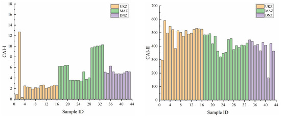 The CAI provides a more effective evaluation of the extent of cation exchange between water samples and adjacent rock formations [54]. Negative CAI values (CAI-I, CAI-II) signify the exchange of Ca2⁺ and Mg2⁺ in groundwater with Na⁺ and K⁺ from the host rock or soil, whereas positive CAI values indicate the replacement of Ca2⁺ and Mg2⁺ in the rock or soil by Na⁺ and K⁺ in groundwater. Higher absolute CAI values imply stronger ion exchange activities.