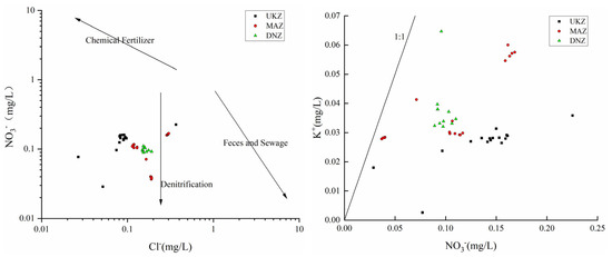 Relationship between NO3−/Cl− and K+/NO3− in the study area.