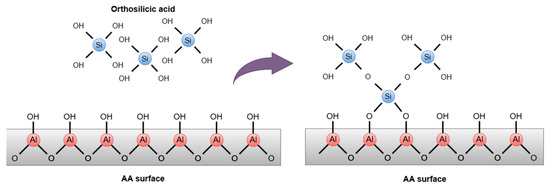 In contrast to SBA that is effective for silica removal at high pH conditions, AA has been evaluated to remove dissolved silica due to its high adsorption capacity and selectivity for silica species [41]. The orthosilicic acid (H4SiO4 or Si(OH)4) can attach to the OH− groups in the surface of the hydrated AA, as shown in Figure 1 [42,43]. The AA has been reported to show an improved performance under a pH range of 8.0–8.5 and, contrary to SBA, ions such as SO42−, F−, HCO3−, and NO3− shows no significant effect on AA [41,44,45].